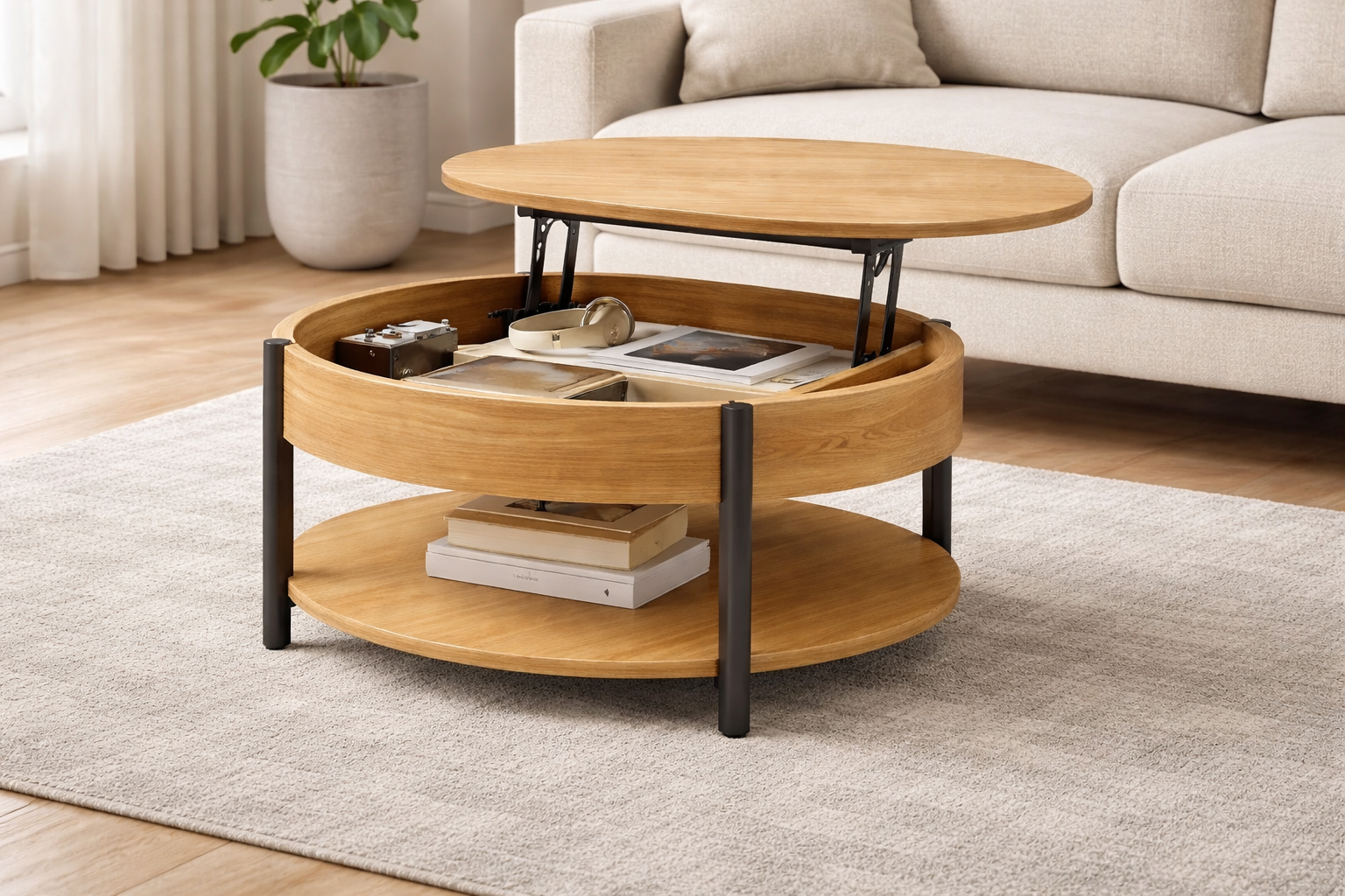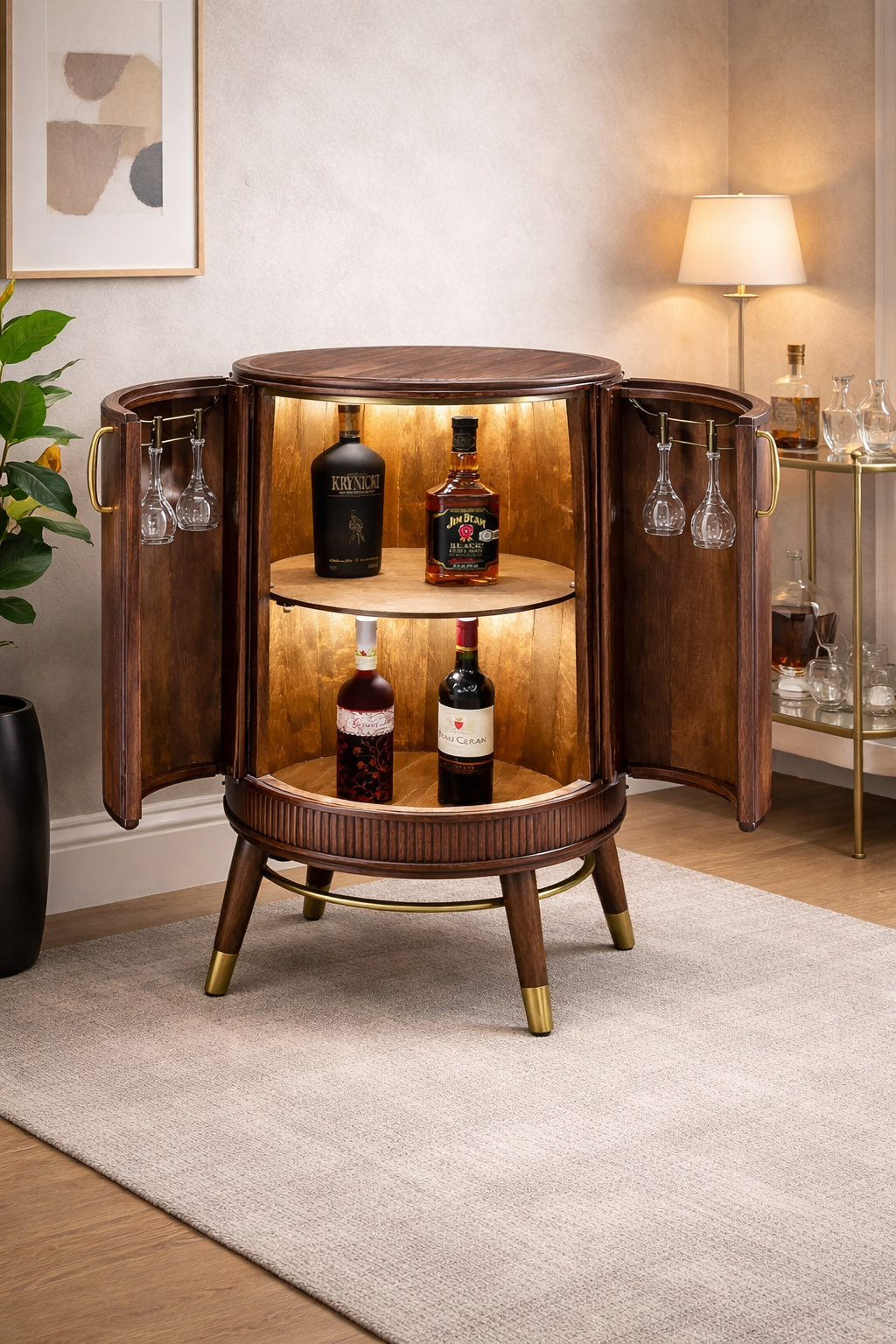 Meuble bar rond avec portes ouvrantes et espace rangement bouteilles et verres structure stable design elegant ideal salon ou espace reception usage pratique et decoratif